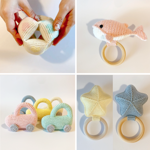 🚗 Les voitures en crochet sensoriel – des hochets aux teintes pastel, parfaits pour les petites mains curieuses.